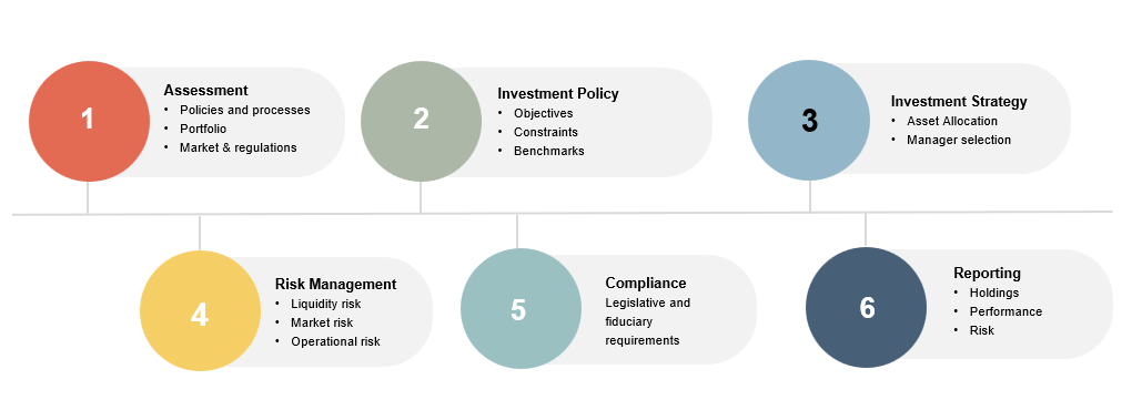 We begin by establishing clear investment policies and defining measurable goals within the framework of legislative and fiduciary requirements. Through comprehensive market assessment, strategic asset allocation, and careful manager selection, we seek to optimize returns while managing risk across varying market conditions. Regular performance reporting, compliance oversight, and dynamic portfolio reviews ensure that your investments remain aligned with both your long-term strategy and the evolving regulatory and economic landscape.